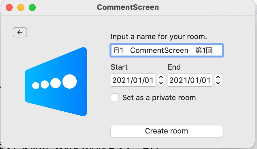 - 「月1(授業名)第1回」のように授業やイベントを表す適当なルーム名を入力し,日付を選択した後,「Create room」ボタンを押します.