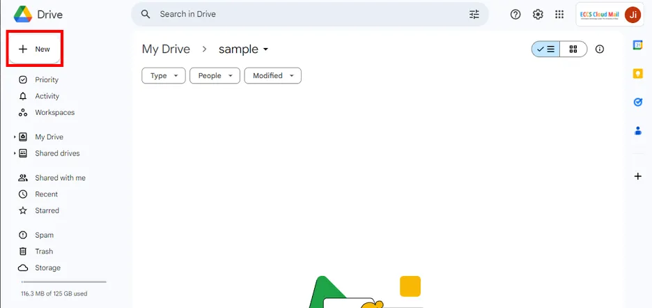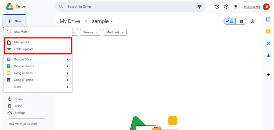 To proceed with the following steps, make sure you are already logged into ECCS Cloud Mail and have Google Drive open in your browser. If you have not completed these two steps, please refer to “Open Google Drive in the browser” on the Google Drive page (an English translation is planned).