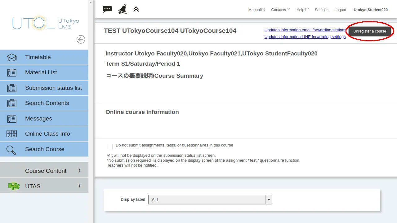 Even if you proceed with the “course registration” in UTOL, you will not be enrolled in the course. Therefore, if you need to enroll in a course, be sure to use UTAS (the academic affairs system) for enrollment registration.