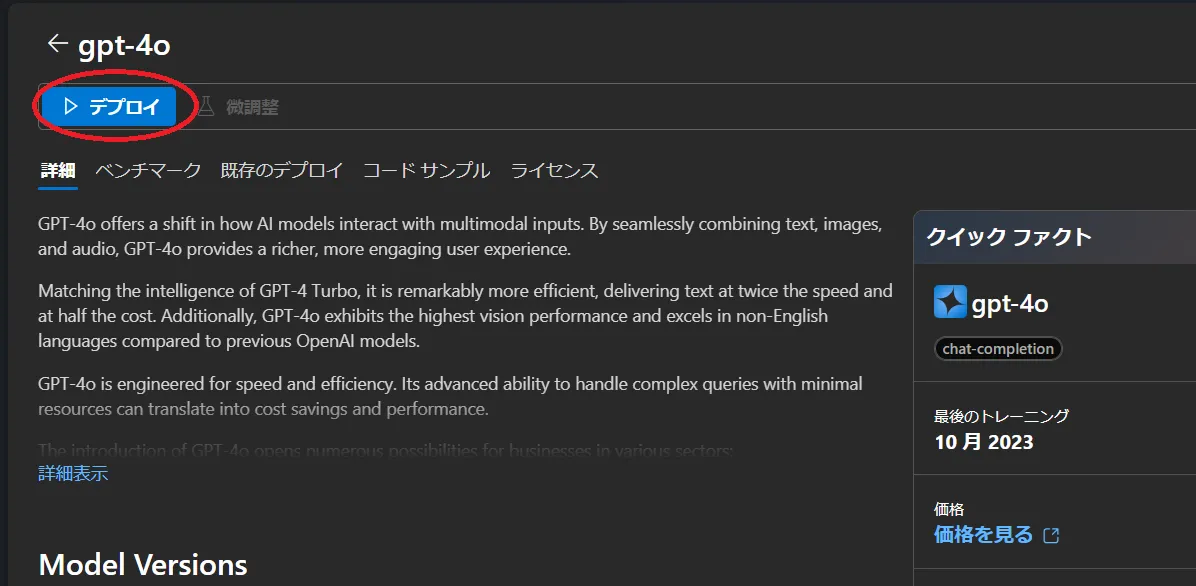 • gpt-4o の詳細画面になるので,画面上部にあるデプロイをクリック.