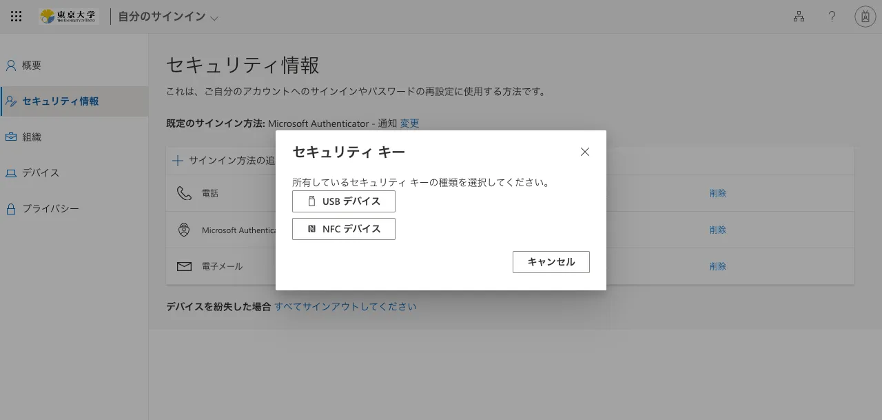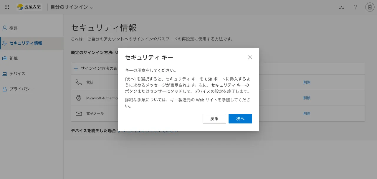 FIDOセキュリティキーは,2個目以降の本人確認方法として登録することを前提としています.多要素認証を初めて利用する方は,「UTokyo Account多要素認証の初期設定手順」の中の「手順1:1個目の本人確認方法を登録する」の手順に従って1個目の本人確認方法を登録してから,追加の本人確認方法としてFIDOセキュリティキーを登録してください.