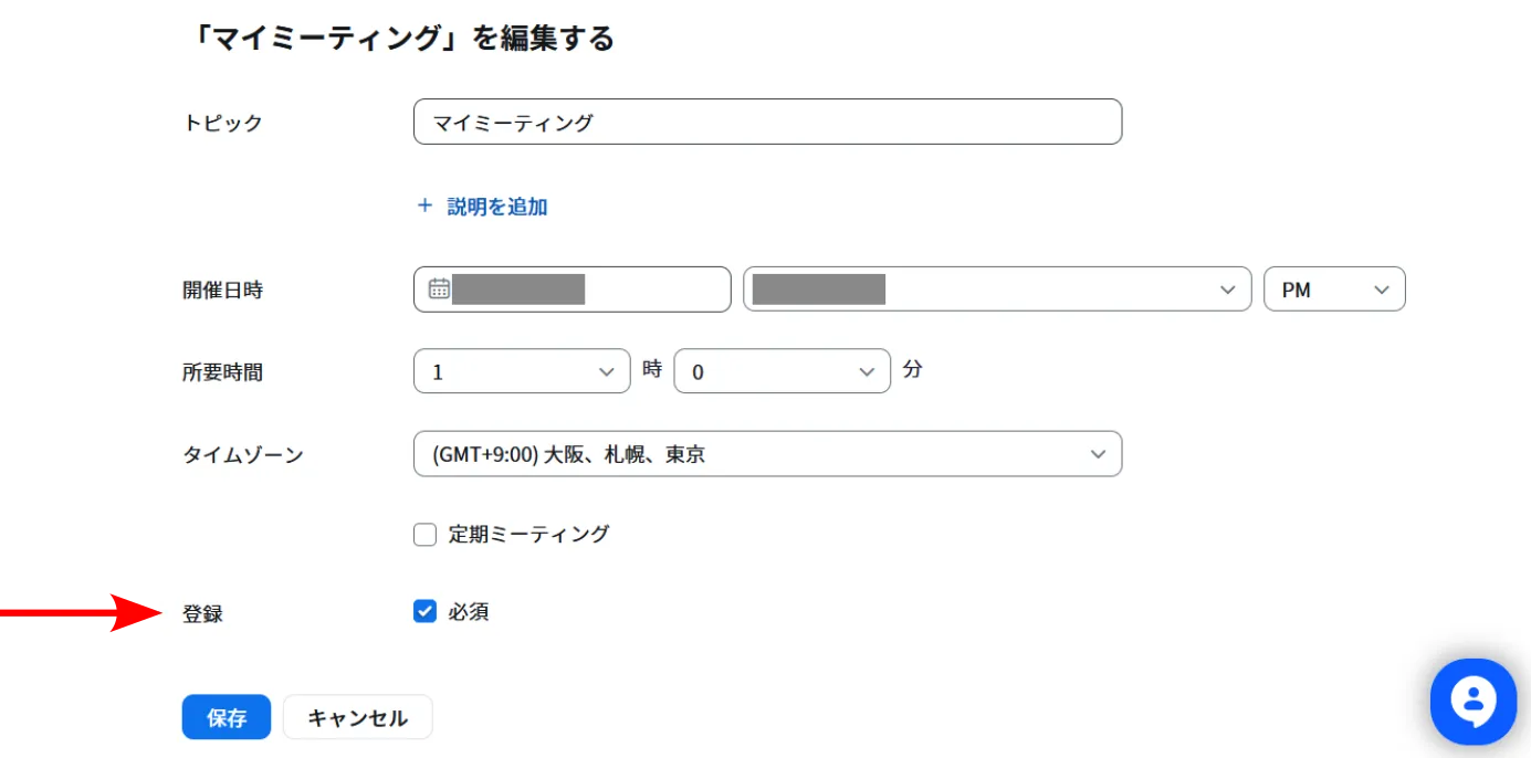 「参加者の登録」が必要なミーティングを新しく作成する場合