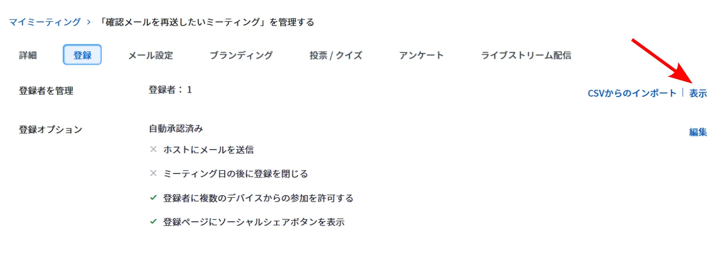 ※参加者の手動承認を設定している場合(後述)は,「承認済み」リストに表示されている参加希望者にしか,確認メールを再送できません.