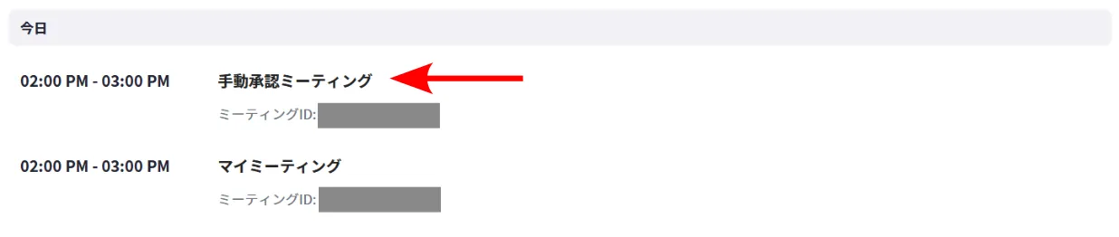2. 自分のスケジュールしたミーティングが,リストとして表示されます.手動承認オプションを有効にしたいミーティングの名前を押してください.