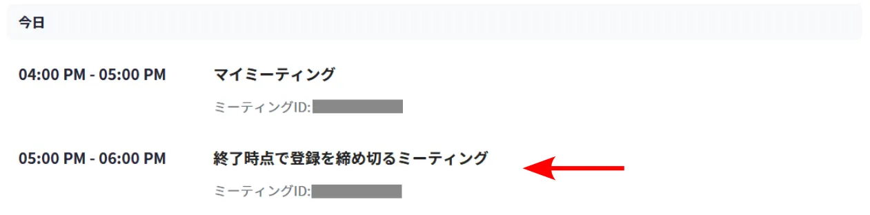 2. 自分のスケジュールしたミーティングが,リストとして表示されます.終了予定時刻が過ぎた時点で登録手続きを受け付けないようにしたいミーティングの名前を押してください.