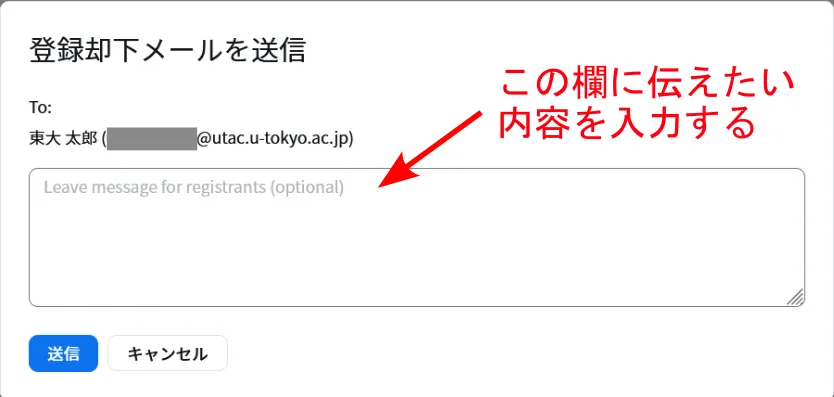 7. 「登録却下メールを送信」という画面が表示されます.拒否した参加希望者に伝えたい内容を入力し,「送信」を押してください.ここで入力した内容が記載された登録却下メールを,拒否された参加希望者は受け取ります.