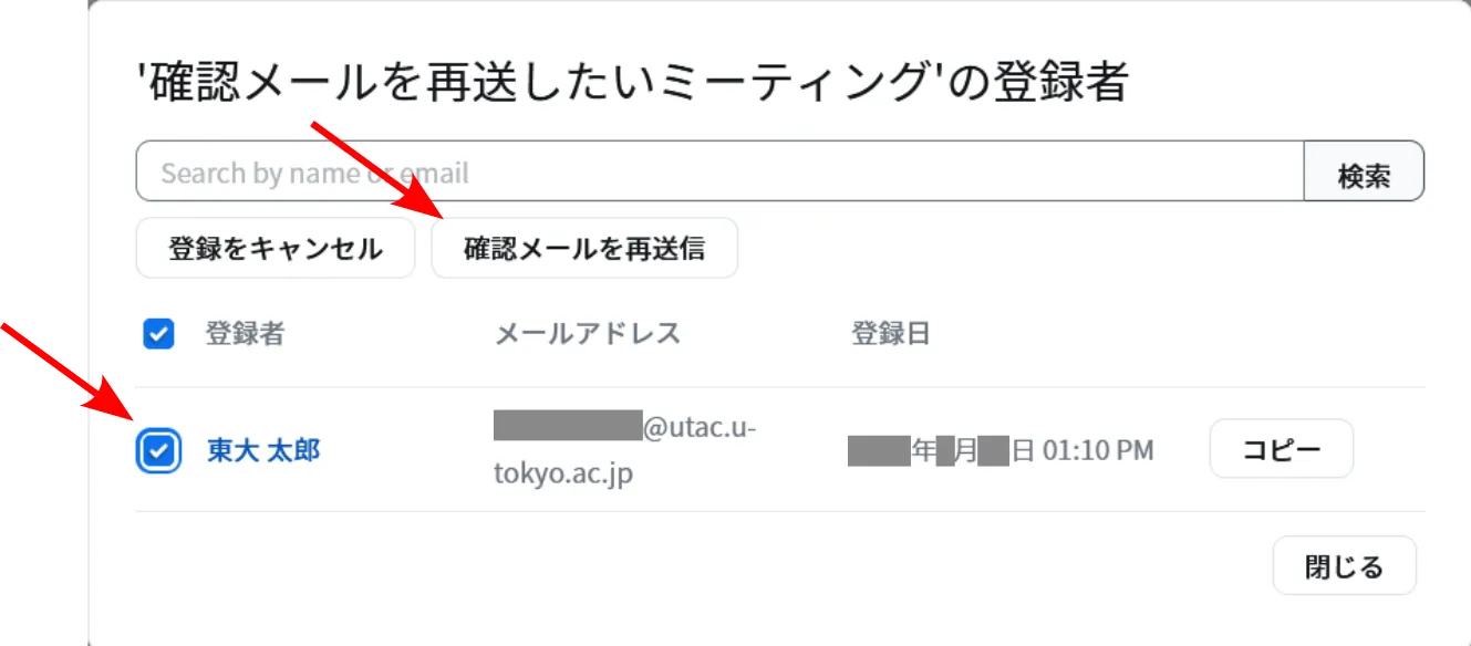 6. 確認メールを再送したい登録者のチェックボックスをオンにして,「確認メールを再送信」ボタンを押してください.