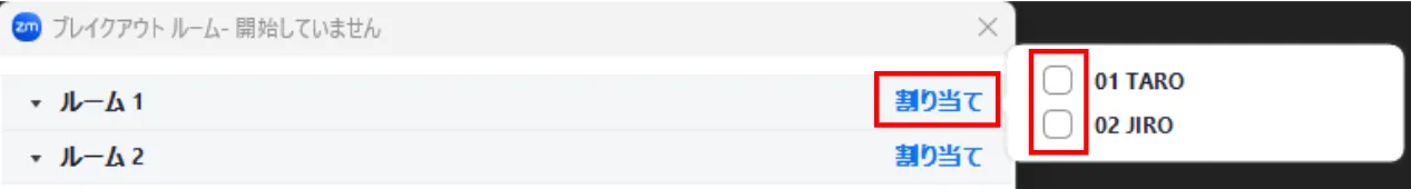 - まだ割り当てられていない参加者の一覧が横に出るので,そのルームに割り当てたい参加者にチェックをつけて選択してください.