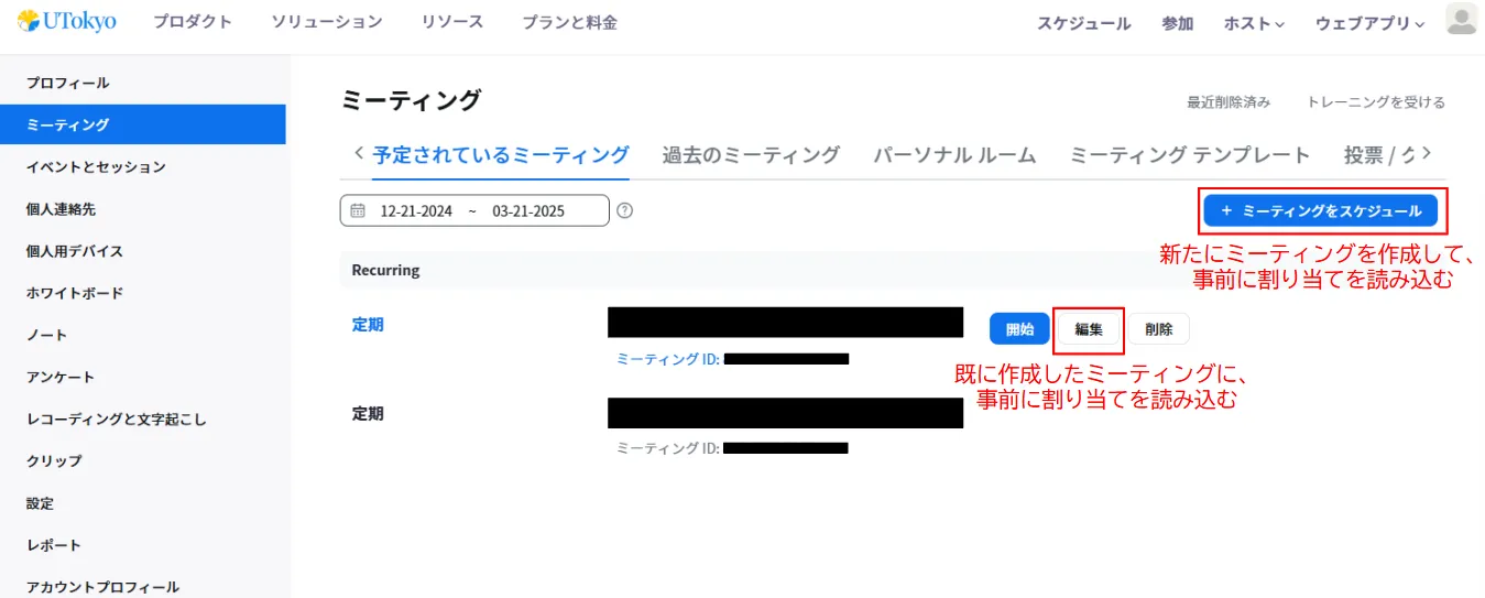 - 割り当てが読み込まれたミーティングを新しく作成する場合は「ミーティングをスケジュール」を,すでに予定されているミーティングに割り当てを読み込む場合は「編集」を押してください.
